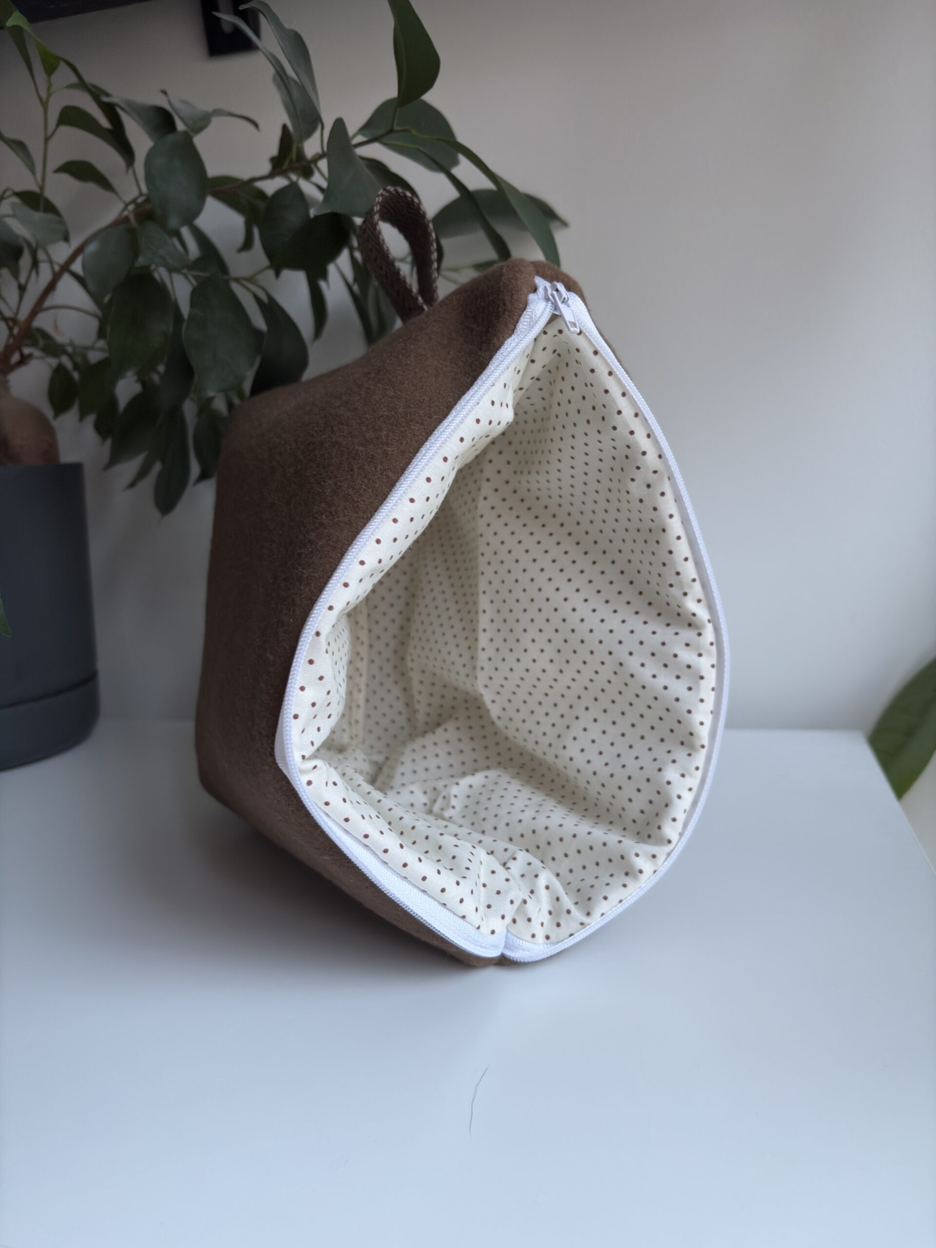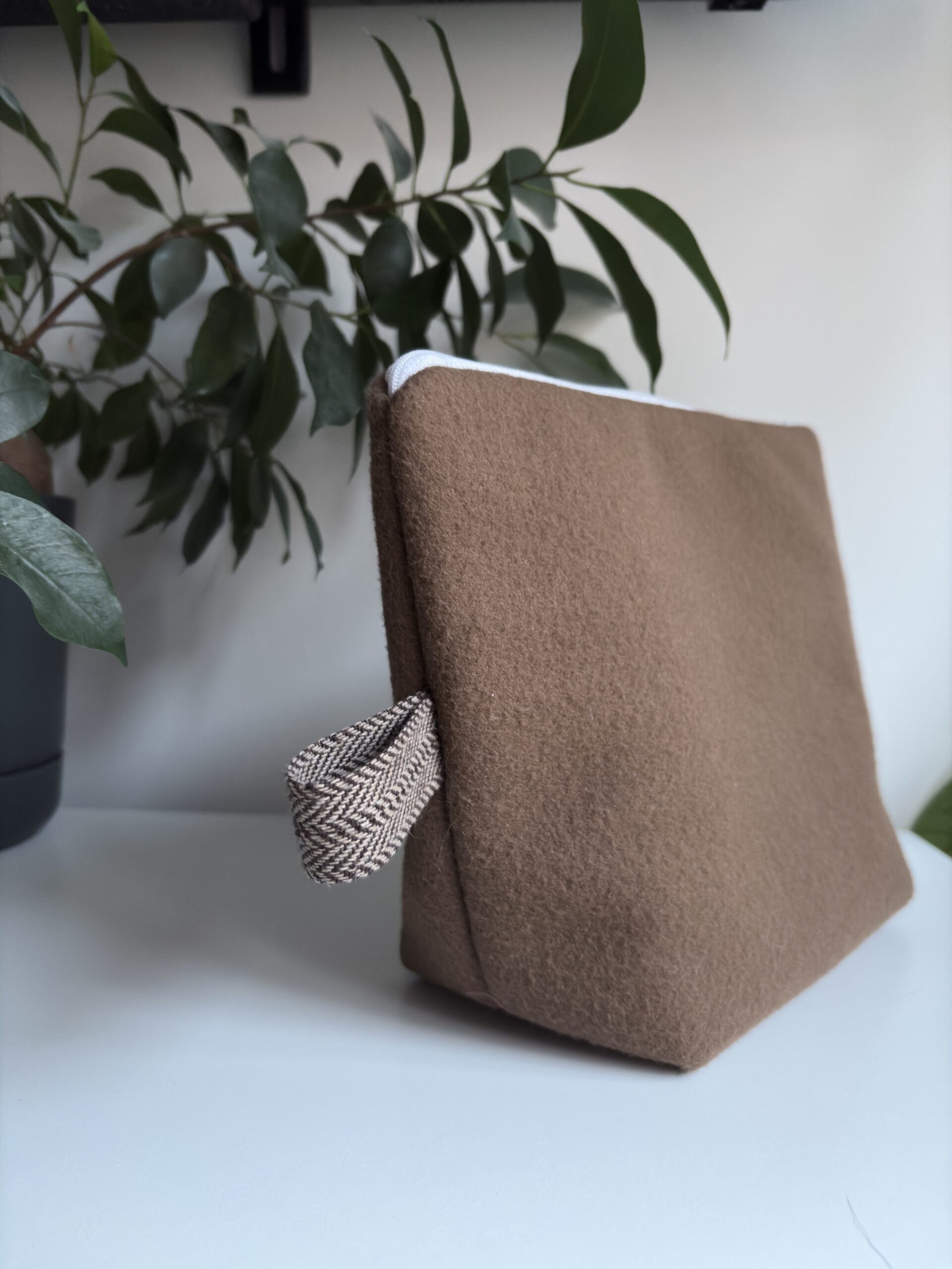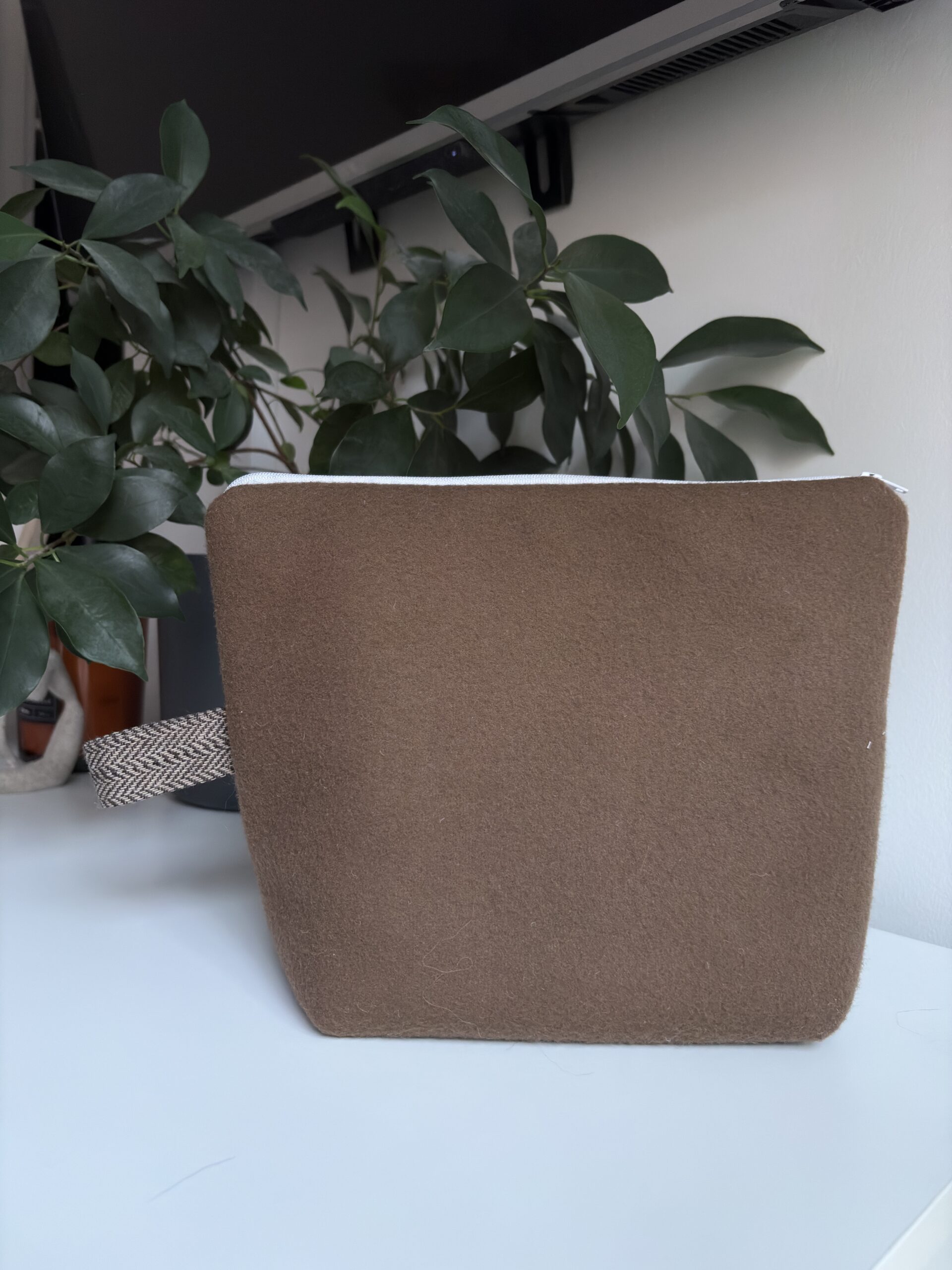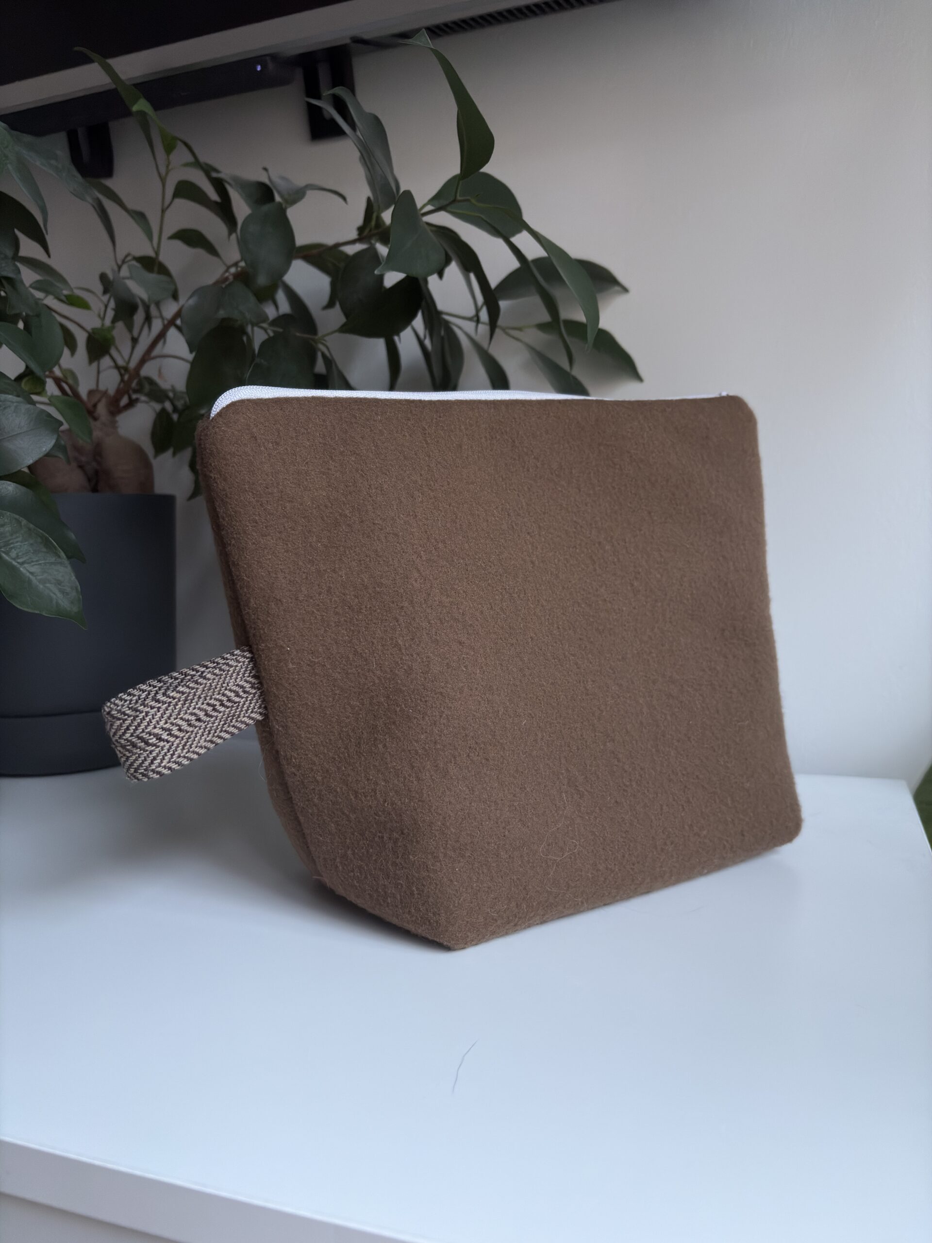 Stylowa i funkcjonalna kosmetyczka wykonana z wytrzymałej tkaniny tapicerskiej w eleganckim brązowym kolorze.