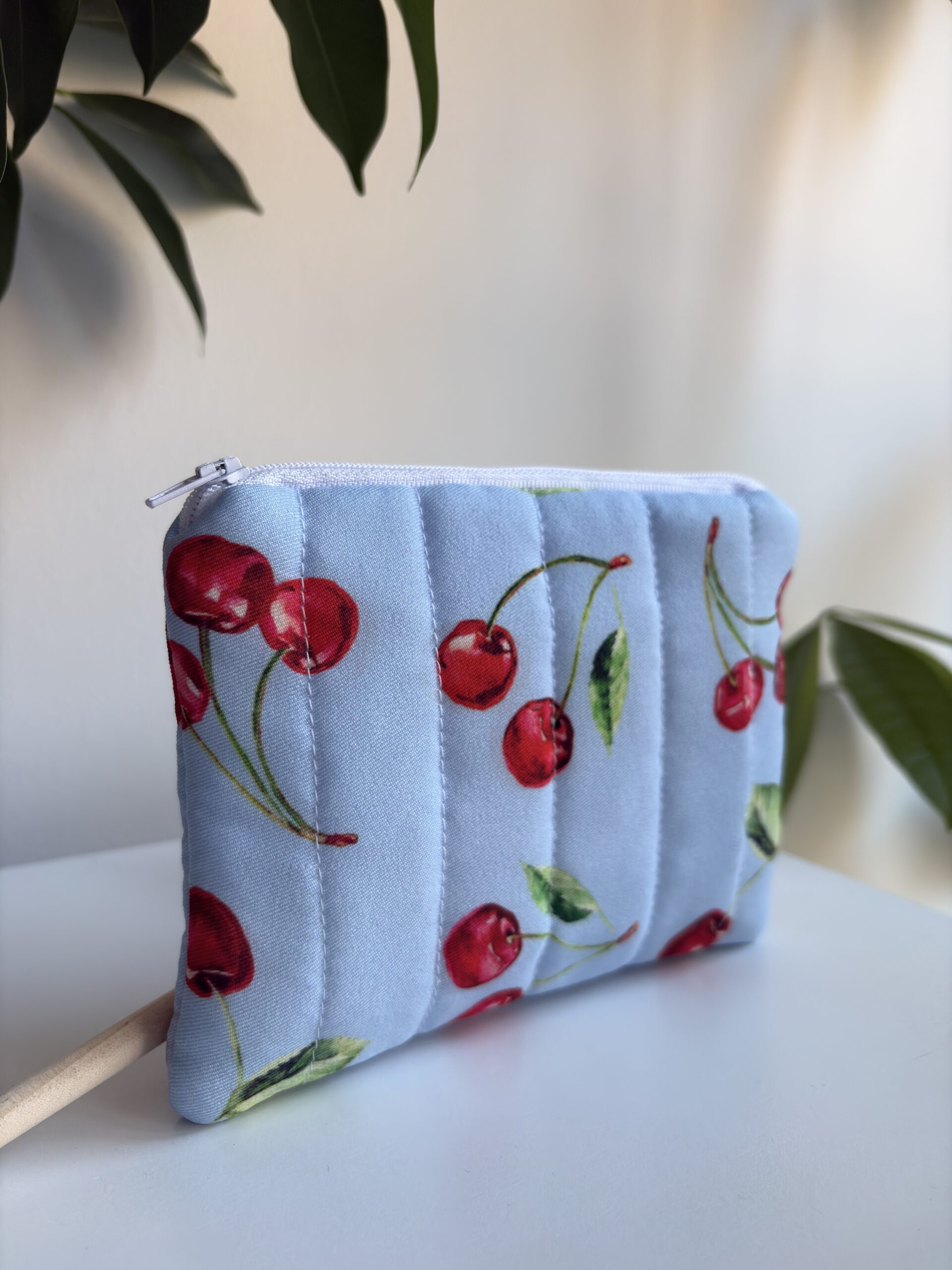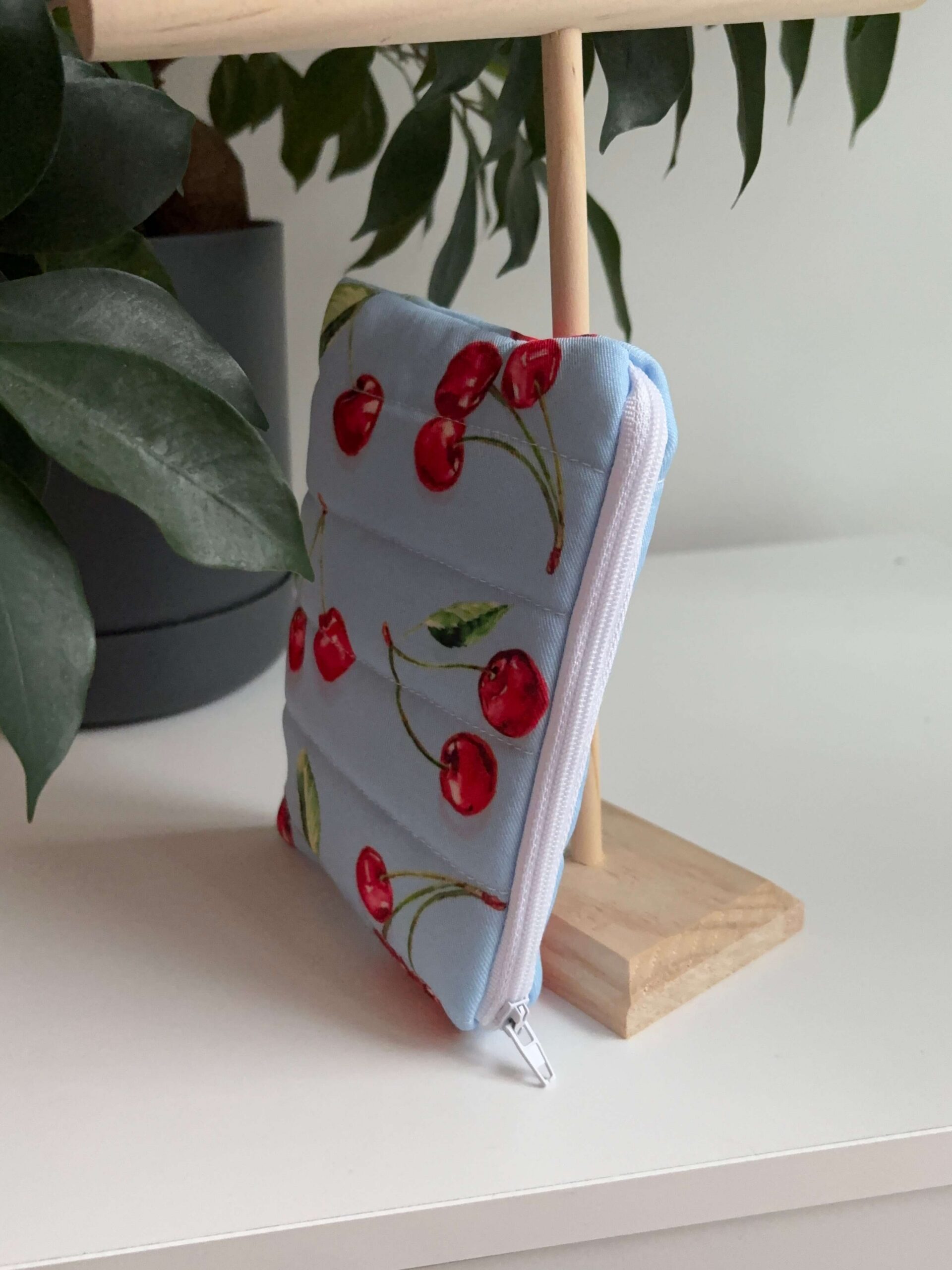 Portfelik wykonany z wiskozy w kolorze baby blue z wiśniowym printem.